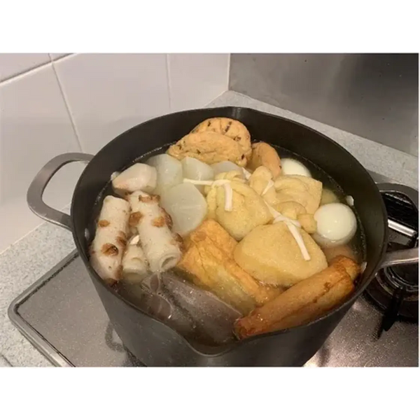 Oden is a popular home-cooked dish eaten during the wintertime in Japan. It is a simmered recipe containing vegetables and nerimono – fish or meat that has been ground, seasoned, and kneaded into a cake. These ingredients are combined and simmered in a flavorful dashi broth.