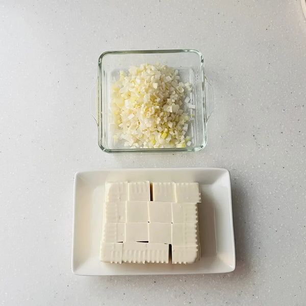 There are several ways to remove excess water from tofu and maintain its shape. In this recipe, we recommend boiling the tofu for a few minutes as part of the preparation.