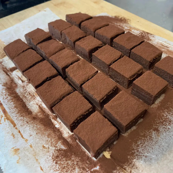 Nama chocolate, which roughly translates to raw chocolate is a Japanese sweet made by melting chocolate with heavy cream and making a chocolate ganache, letting it set, cutting the final product into smaller pieces, and dusting them with cocoa powder.