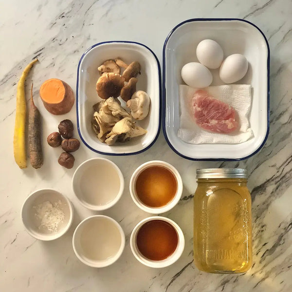 Now, let's talk about the magic that happens with the custard. It all begins with a blend of eggs, dashi, along with a hint of soy sauce and mirin. However, the real excitement unfolds when you introduce the ingredients. Common additions include sliced shiitake mushrooms, plump shrimp, tender chicken, Kamaboko (fish cake), ginkgo nuts, and mitsuba (Japanese parsley). It's like a symphony of flavors in a tiny vessel. This time, we're introducing an autumn-inspired chawanmushi recipe!