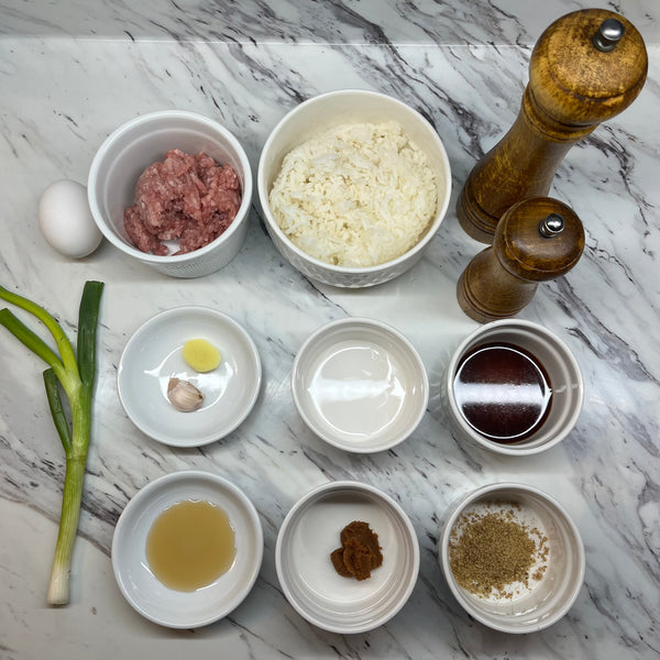 Prepare garlic, ginger, ground pork, day-old rice, green onions, and seasonings like miso paste, soy sauce, and sake. If desired, sesame oil and pickled ginger.