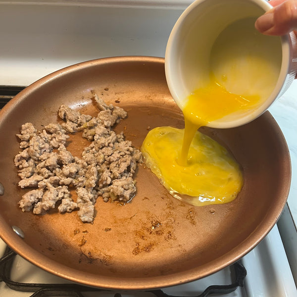 Push the cooked ground pork to one side of the pan. Pour the beaten egg into the empty space and cook until it begins to set.