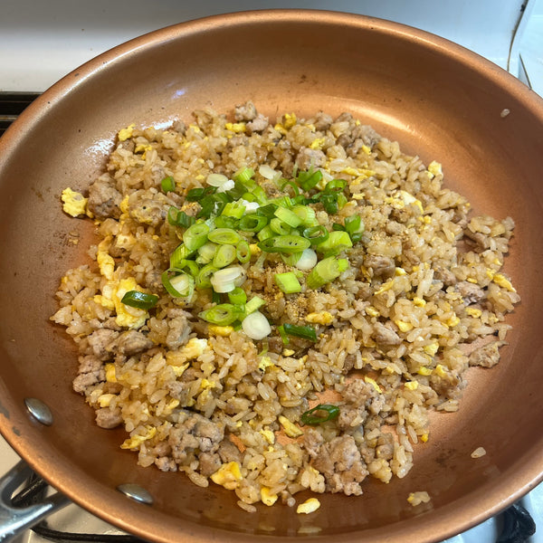 Add the cooked rice to the pan and lower to medium heat. Stir to break up any clumps, then mix the rice with the pork, egg, and other ingredients until well combined.