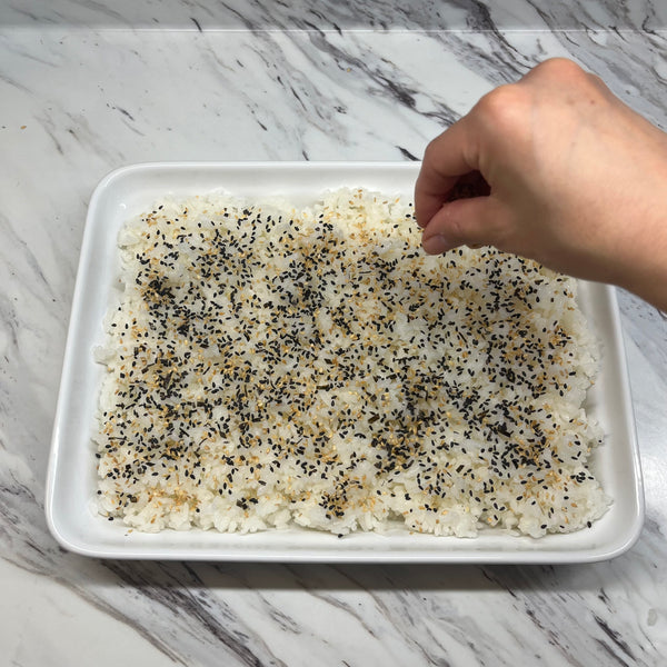 Once the mixture is spread evenly over the rice (an ice cream scoop helps with this), the whole dish is baked until the top is golden and lightly crisped. It’s then scooped onto small pieces of nori and eaten like a mini hand roll. You can also serve it with fresh cucumber, avocado, pickled ginger, or jalapeño on the side for extra flavor and kick.