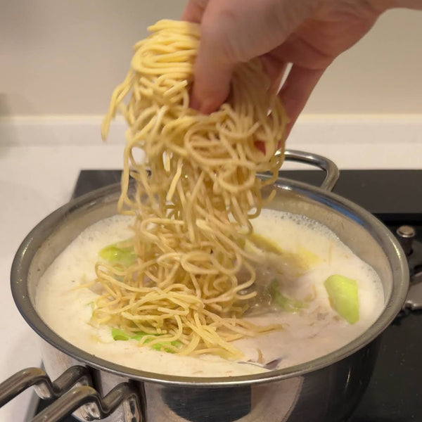 Aside from preparing the broth, champon is relatively straightforward to cook. First, you stir-fry ingredients such as pork, seafood, and vegetables. Then, you add the broth to the same pot. Once the broth comes to a boil, the champon noodles are added and simmered until fully cooked.