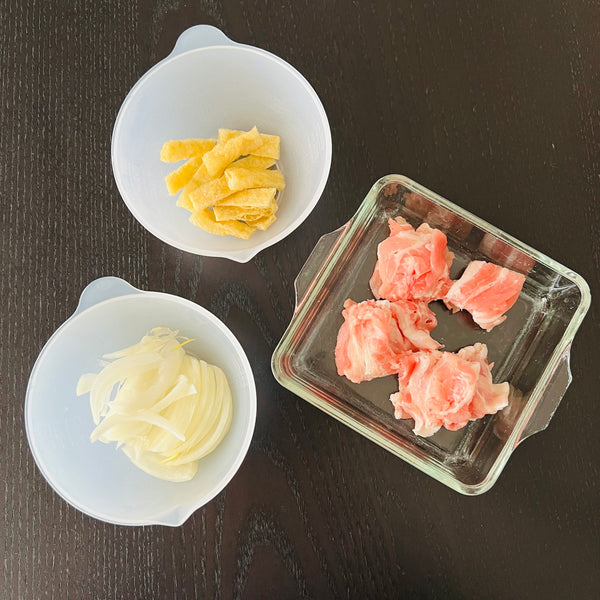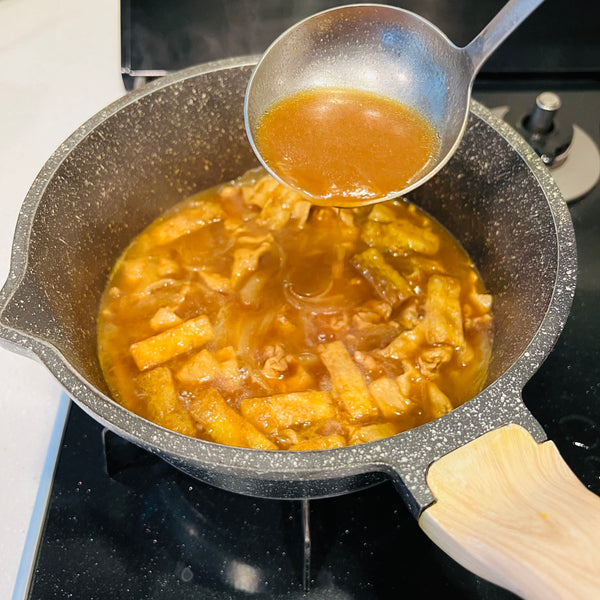 Beyond these core ingredients, you can add whatever you like. There are no strict rules for additional ingredients. In this recipe, I chose pork, onion, aburaage (deep-fried tofu pouches), and green onion, but you can also use other meats and vegetables, such as chicken, beef, carrots, and mushrooms.