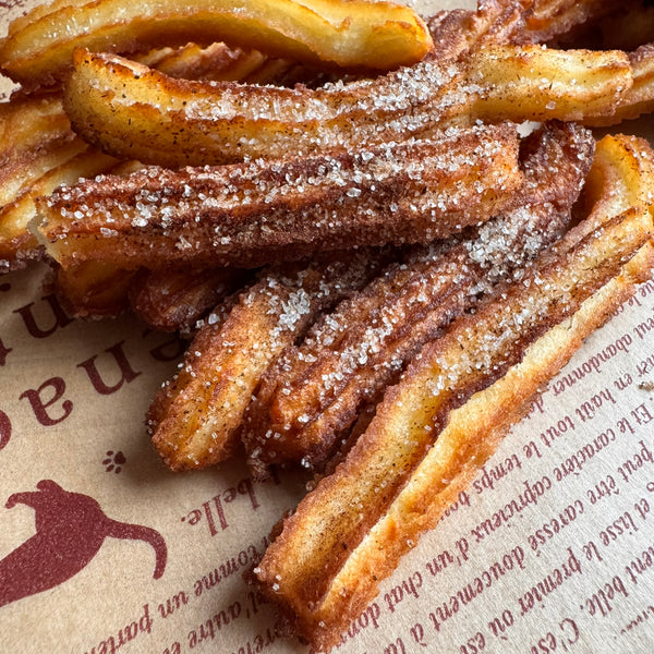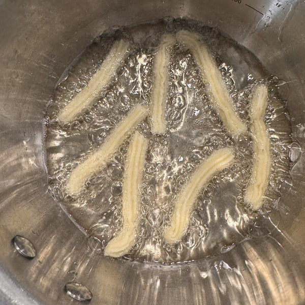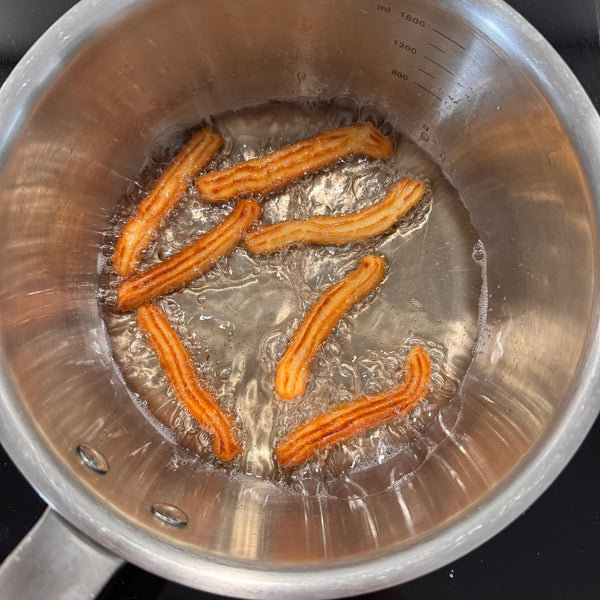 • To prevent sticking, carefully lower the entire baking sheet into the oil instead of dropping individual churros in.