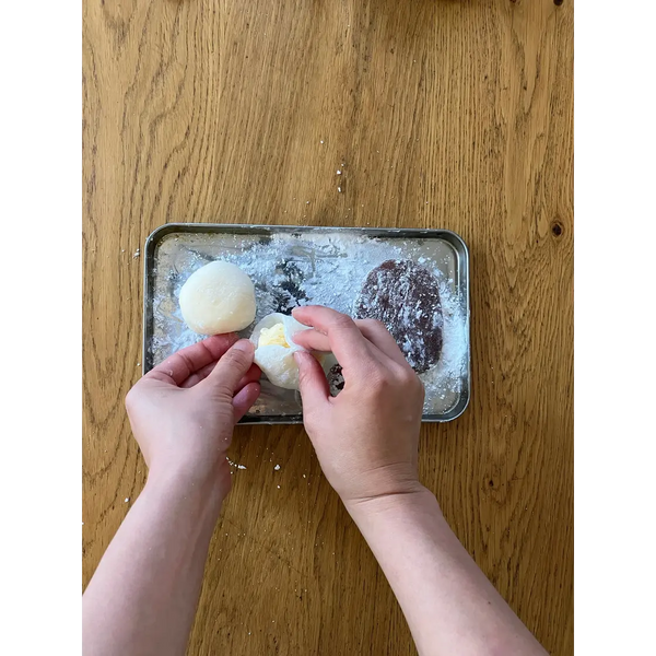 There are many different kinds of mochi in Japan, but the mochi used for making mochi ice cream has a soft and chewy texture. It is also not too sweet. When you take a bite of mochi ice cream, you can enjoy both textures of chewy mochi and ice cream. The sweetness of the ice cream also matches perfectly with the chewiness of the mochi!