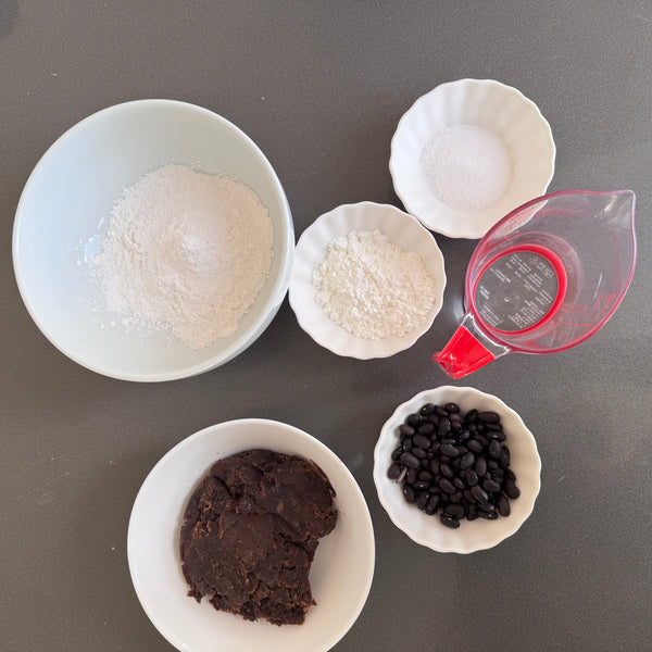 Prepare the black beans, glutinous rice flour, sugar, red bean paste, and starch for dusting.