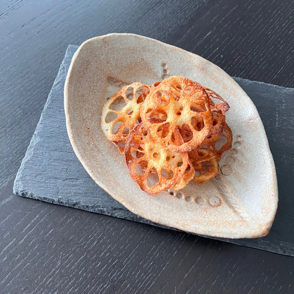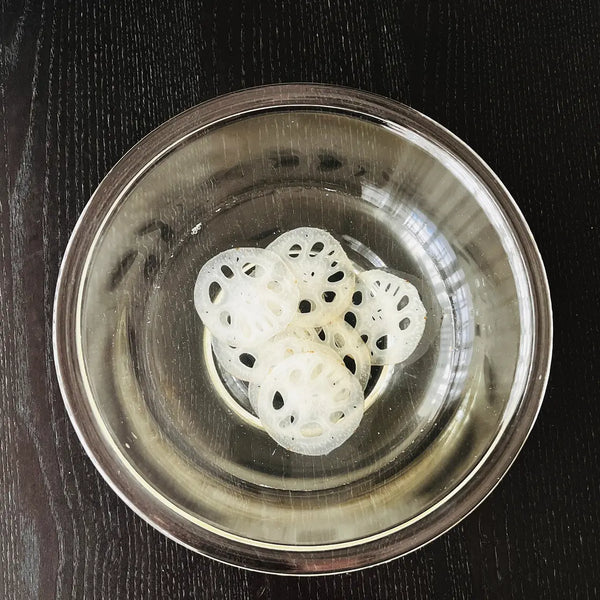 Soaking the lotus root removes excess starch from the vegetable, which also leads to crispier chips.