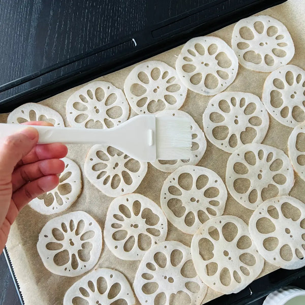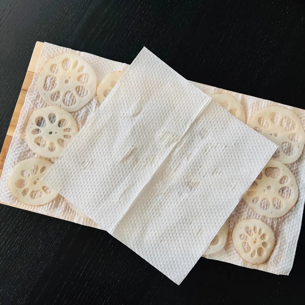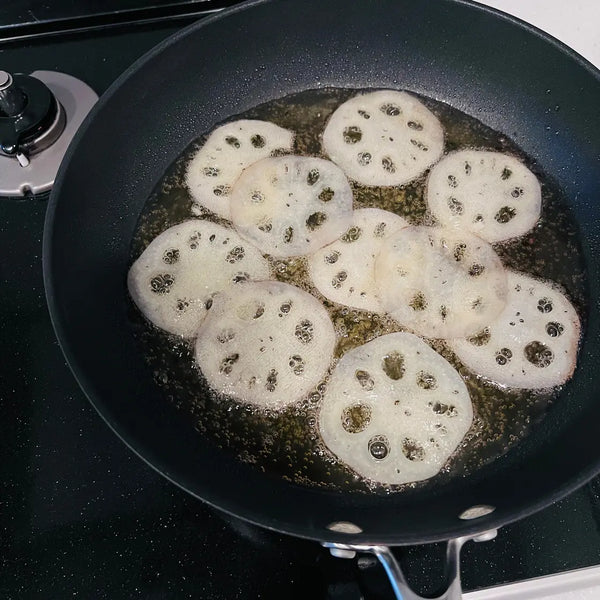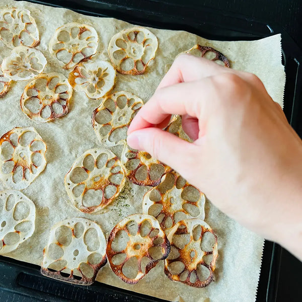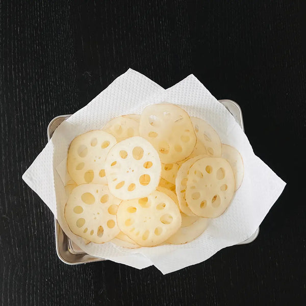 It is important to dry the lotus root pieces well before frying or baking them. Use paper towels to ensure the removal of as much excess water as possible.