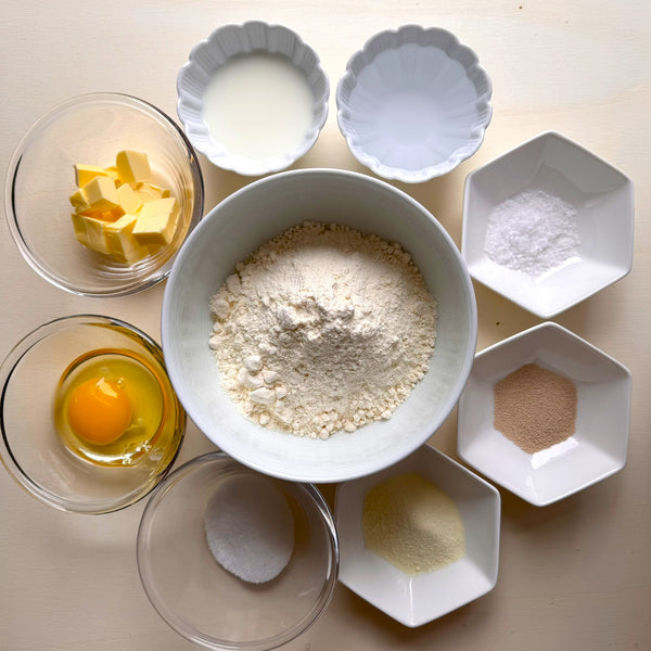 Prepare the ingredients for brioche dough: bread flour, egg, sugar, salt, skimmed milk powder, whole milk, dry yeast, water and butter.