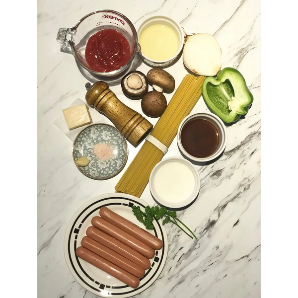 Once the vegetables and sausages are cooked to your liking, add in the prepared ketchup sauce and stir well to combine. Then, add in the cooked pasta and toss everything together using tongs. Season to taste with black pepper.