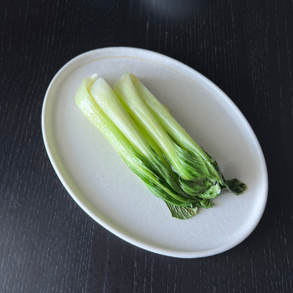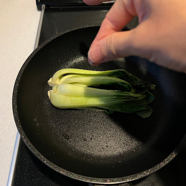 We chose bok choy for its crunchiness, which adds a nice balance to the dish and offers a variety of textures in each bite. To preserve the texture and enhance its flavor, it is quickly stir-fried with sesame oil. The key to making the bok choy topping is speed.