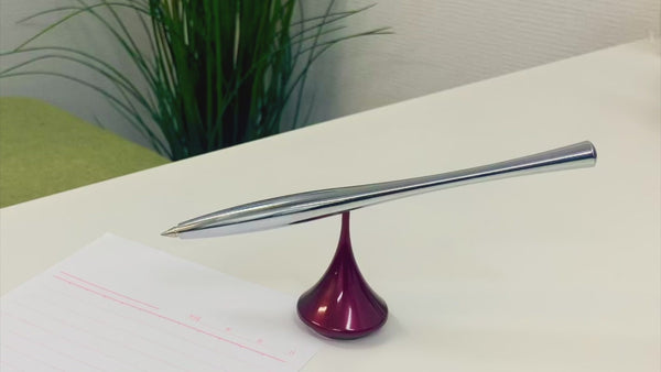 The elegant, pointed pen stand sits firmly on your desk, while the pen balances horizontally on the tip. This gives the pen an almost frictionless feeling, as it seems to float and balance magically on the pen stand. Give the pen a gentle flick with your finger, and watch in wonder as it spins in place.
