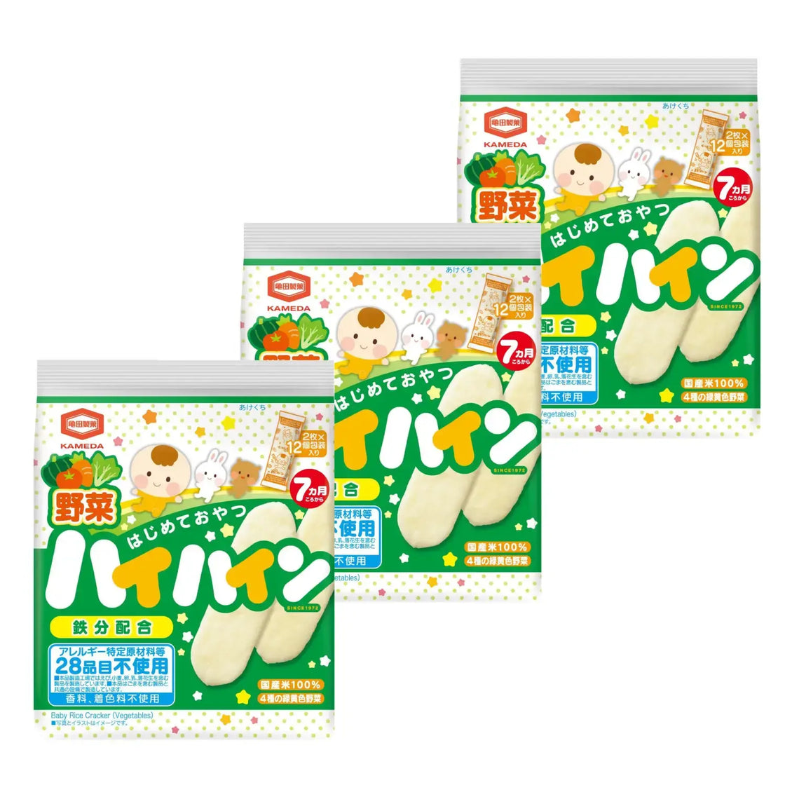 Kameda Hai Hain set of soft crackers for babies made with high quality Japanese rice, vegetables, calcium and probiotic bacteria for a healthy teeth.